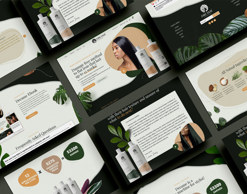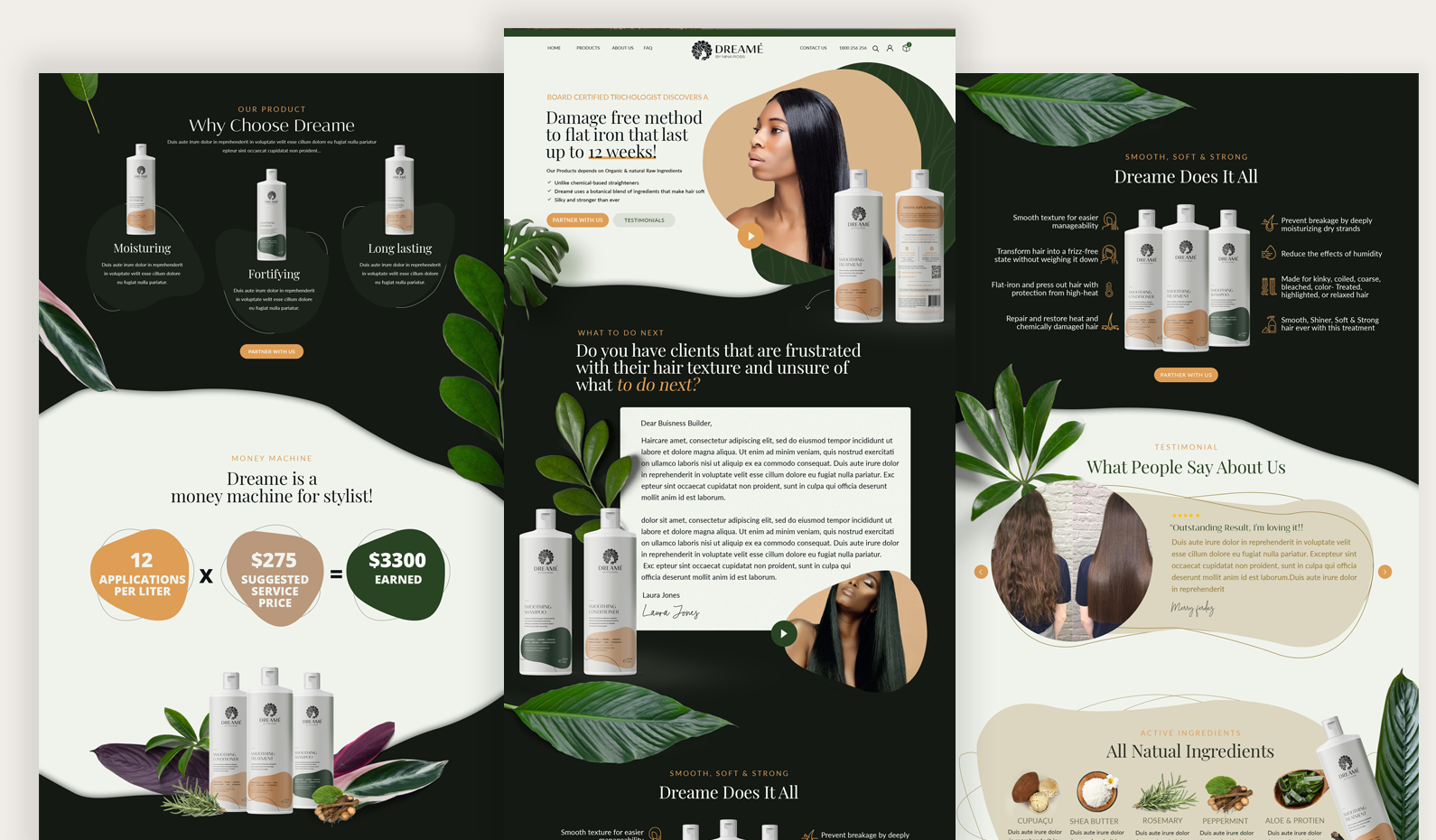 “Dreame Hair” embraces nature’s bounty with its keratin shampoo enriched with all-natural ingredients. Our website design echoes this commitment, immersing visitors in a lush, botanical ambiance. Inspired by the purity of plants and the essence of their ingredients, the site offers an inviting journey into the world of healthy hair care. Experience the fusion of nature and science as you explore their products and their benefits.