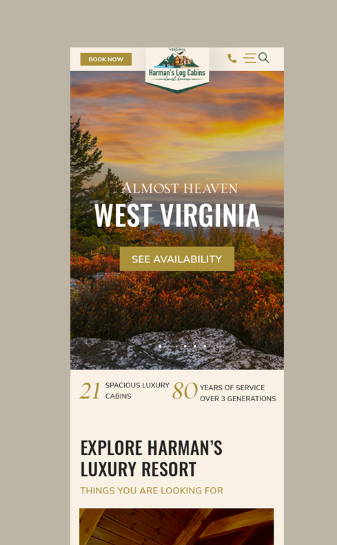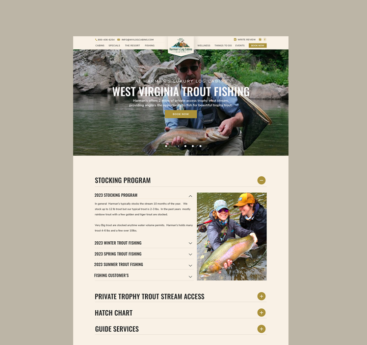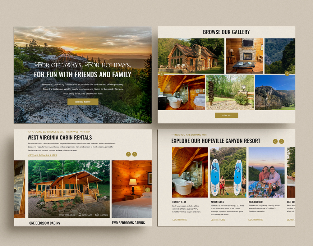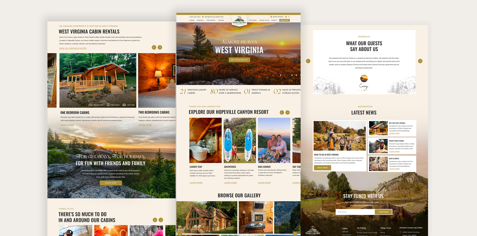 The proprietor of Harman’s Lodge desired a website that featured outdoor exploration in West Virginia’s mountains. A retreat from it all is to feel close to nature, surrounded by trees, streams, and silence. The website must be neat and modern. It is crucial that the website exudes an air of rusticity or nostalgia. Visitors were welcomed to the homepage, which featured a gorgeous panoramic view of the mountains and a contemporary style that complemented the peaceful atmosphere perfectly. A subdued color scheme that mirrored the surrounding environment’s natural tones created the mood for each guest’s immersive experience.